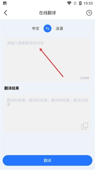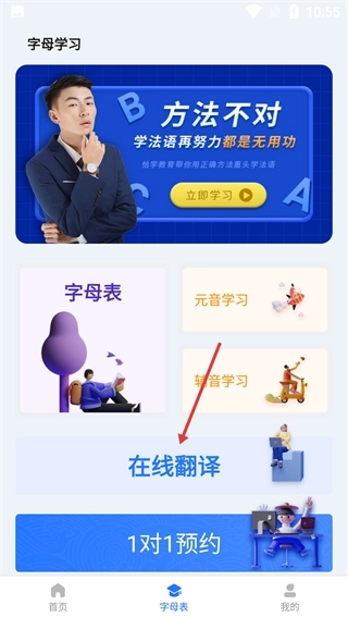 1、在字母学习页面中找到并点击【在线翻译】模块,即可进入支持中法互译的在线翻译功能页面。