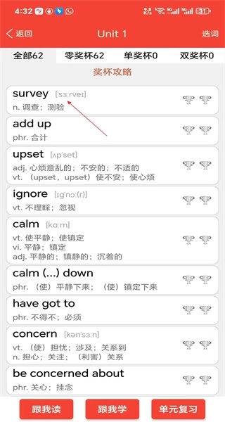 4、进入Unit1单词页面后,会呈现出完整的单词列表以及每个单词对应的释义,用户可以查看单词的具体内容,并开展学习相关的操作。