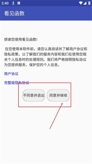 1、在【看见函数】的初始界面,仔细阅读【用户协议】和【完整版隐私协议】,确认无误后点击【同意并继续】按钮,就能进入软件主界面进行后续的操作。