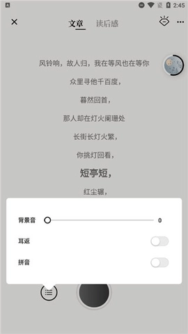 诗音是一款集多种功能于一体的文章阅读工具,在这里你能接触到海量其他用户创作的原创文章,这些内容能为你的创作提供丰富的灵感来源。它还配备了十分人性化的智能朗读功能,无需逐字逐句阅读,使用起来极为便捷;同时,你可以为自己的文章挑选个性化配图,以此提升文章的感染力与表现力。当你完成文章创作后,还能借助软件的朗读功能,闭上眼睛沉浸式地聆听自己的作品。