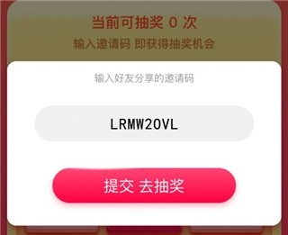 3、在当前界面输入邀请码【LRMW2OVL】并提交,即可直接领取约5元的红包奖励,同时输入邀请码还能额外获得一次抽奖机会。