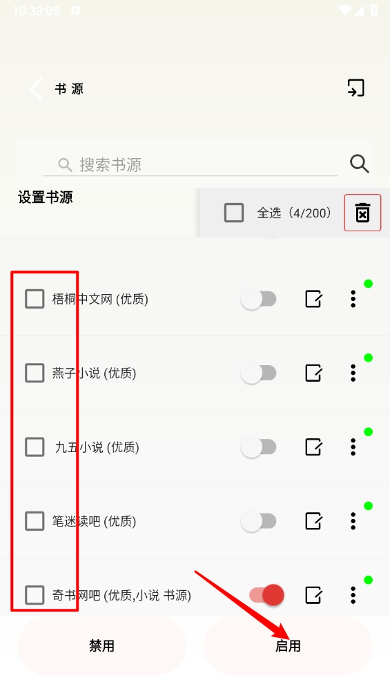 3、进入后勾选所需启用的书源,点击"启用"即可。