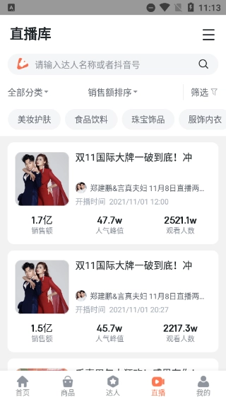 为用户呈现达人直播的销售业绩、观众热度及观看人次等多维度数据信息