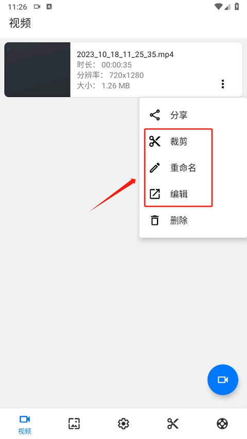 在视频播放界面的右侧区域,有一个由三个点组成的图标,点击它后,系统会弹出包含裁剪、编辑、重命名等功能的操作菜单,通过这些选项可以对当前视频进行相应的处理。