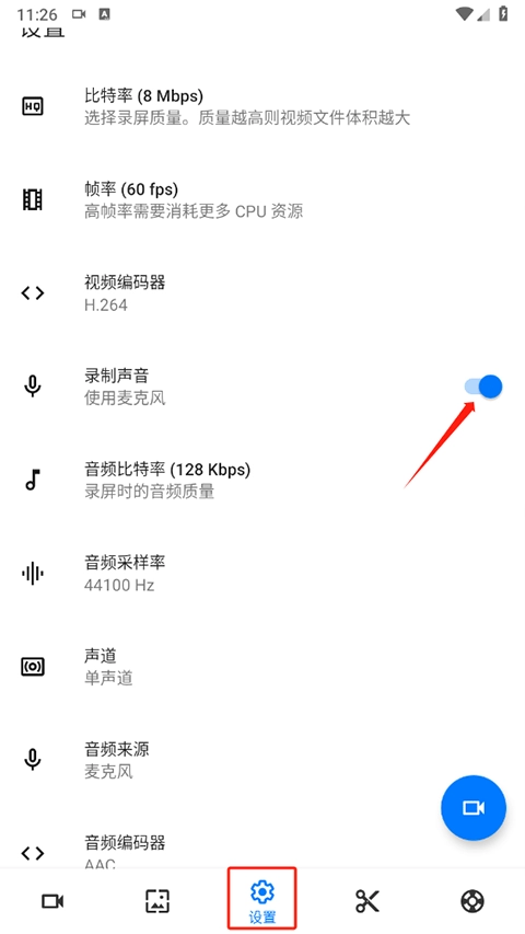 进入设置页面后,向下滑动屏幕找到录制声音的相关选项,把它关闭即可。