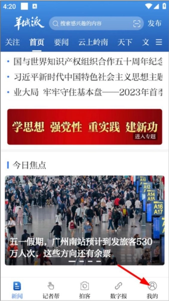 打开羊城晚报电子版并登录进入首页后,用户能在首页浏览每日新闻要闻、今日焦点等内容,之后点击“我的”选项即可。