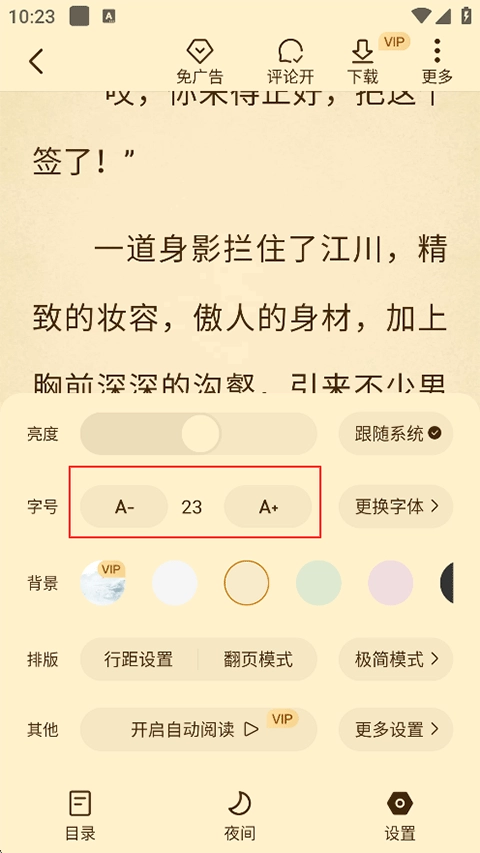 3、在设置页面通过两侧的A-、A+来调整字体大小,点击右侧还可以更换字体。