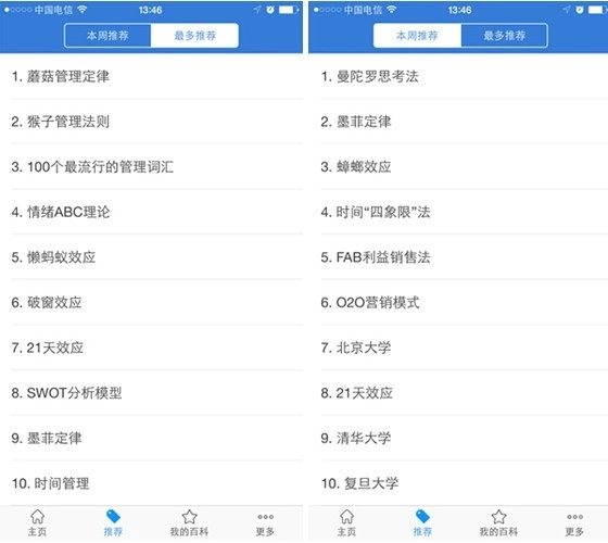 除主页外,MBA智库百科还设有推荐阅读页面。该页面包含本周推荐和最多推荐两个板块,会依据热门程度分别为用户呈现10个本周或近期热度较高的名词,方便用户进行了解。