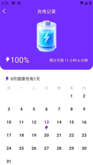 2、在首页能够看到当前电量的显示情况以及预计可用时长,下方还设有充电记录和电池预警等功能模块。