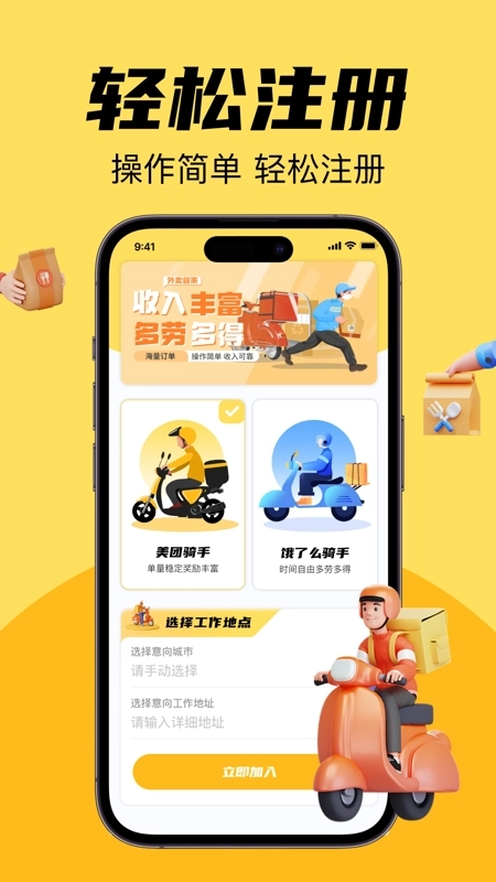1、整合多个平台的注册入口,骑手不用切换多个应用,能直接在该软件里选择美团、饿了么等平台完成注册并接单。