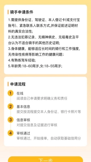 3、申请骑手前,需要查看详细的骑手申请条件,申请流程也会详细提供。