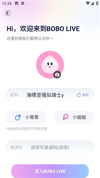 3、首次登录后,输入你的昵称并选择性别,即可直接进入主页;