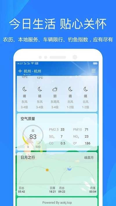 3、日出日落:以动态形式呈现日出与日落的时间,并附带空气质量、风力、风速等相关提醒信息