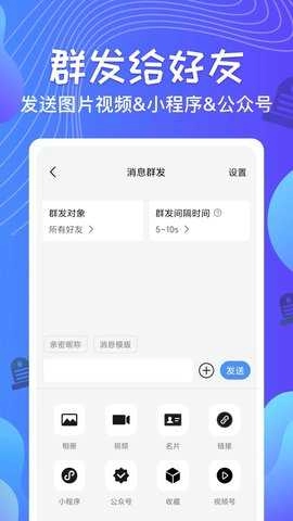 支持将相册里的图文和文字合并后进行群发,把消息群发给可接收信息的好友与聊天群,能大幅提升群发效率,增强推广效果。